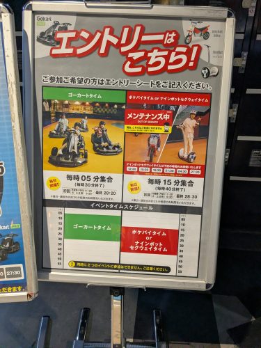 - ゴーカートは毎時5分、セグウェイ・ポケバイは毎時15分にローラーリンクに集合する