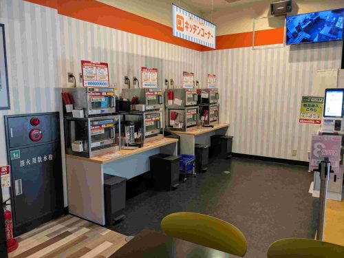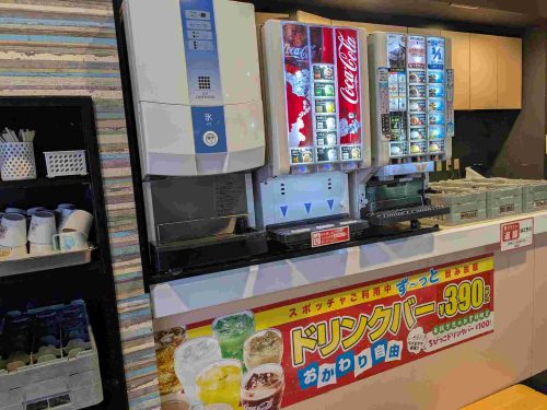 また、ドリンクバーのマシンや各種コップもフードコートエリア内にあります。