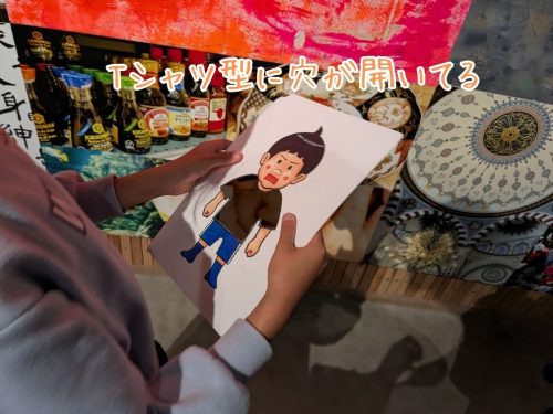 Tシャツ型に穴のあいたプレートを重ねて、変な模様を自分で色々作る、というもの。
