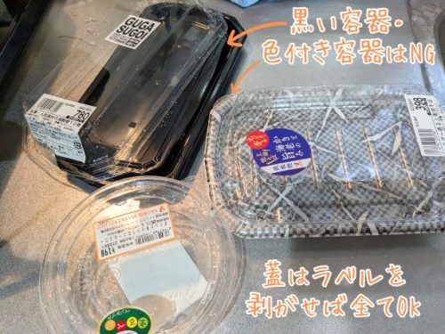 卵パックや色付き透明容器、プリン・ゼリーなどのカップ、食品容器以外のものはリサイクルできません。