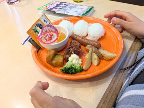 小学3年生でもまだおこさまメニューな娘は、本日も「おこさまおにぎりプレート(ゼリー・ガチャコイン付き)」で、599円(税抜)がなんと299円!!(税抜)