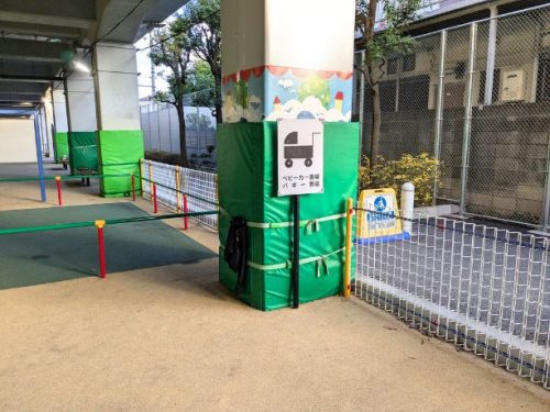写真には撮り切れなかったのですが、自転車置き場・ベビーカー置き場は1か所ではなく、広いこの中央高架下公園のエリアの中のあちこちに整備されているので、いっぱいで停められない…!ということもなさそうです。