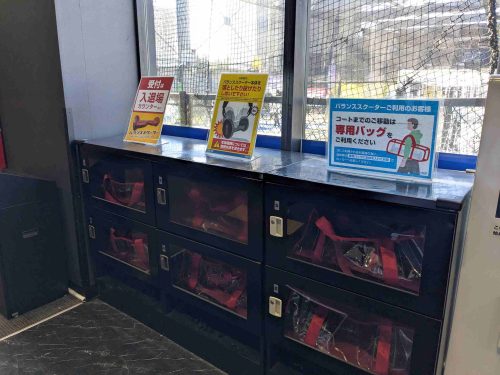 屋上エリアでできるバランスクーターの利用にあたっては、下のフロアのスポッチャ入退場受付のところで申し出て、バランスクーターが入っているロッカーの鍵を借りる!ということ。