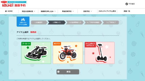 ゴーカート・セグウェイ・ポケバイウェブから事前にアイテム予約として予約することができるようになっていました!(当日受付も可能)