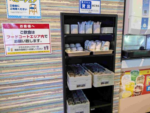 また、ドリンクバーのマシンや各種コップもフードコートエリア内にあります。