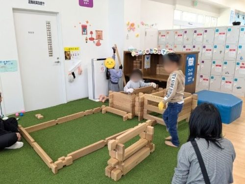 その他、わくわくパークには3歳以上が遊べる壁遊具(ボルダリング)、この日は男の子達が夢中で遊んでいた組み立てて遊べる大きなおもちゃなどもあります。