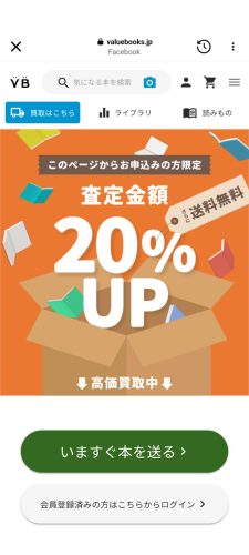 バリューブックスはFacebookでお得なクーポン配信中!20%査定金額UP&送料無料も!