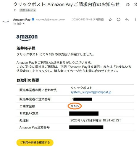 今回はAmazon Payを利用し、投函したその日に決済完了メールが届きました。